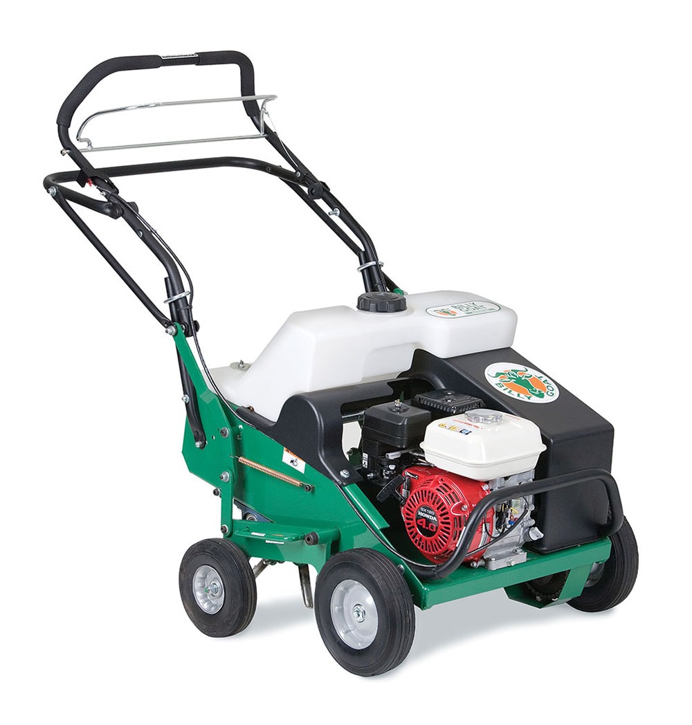 48 cm wide petrol aerator. The wheels work outside the working part, do not slip and facilitate entry / exit on ramps with mounted pins. Instead of massive steel weights, the water or sand load box is positioned directly above the pins for better aeration depth. The Lift N Lock ™ function allows the working drum to be lifted. Fold-n-Go ™ handles and easy folding make handling and transportation convenient and simple. An overhead valve, a commercial engine of the Japanese brand Honda, model GX120, with a cast iron cylinder sleeve, a forged crankshaft on steel ball bearings. The engine is designed to work in extremely difficult conditions. Working speed from 0.8 km / h to 6.5 km / h, front-wheel drive with chain transmission. Drive wheels located outside the width of the scarifying cassette eliminate the possibility of skidding, unlike the models with a wheel in the middle, and make it easier to drive up and down ramps with mounted pins.